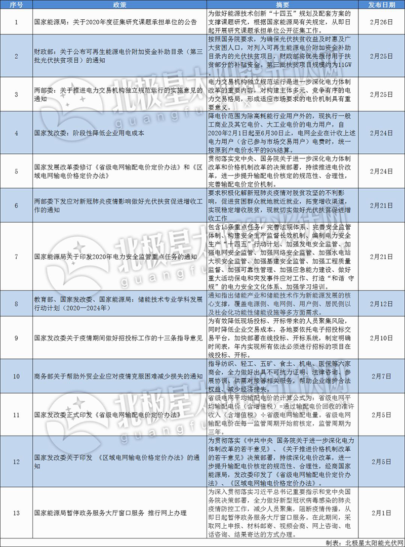 由此,北極星太陽能光伏網(wǎng)梳理了2月光伏政策,其中國(guó)家層面共出臺(tái)13項(xiàng),涉及光伏扶貧、電力交易、電力安全等;地方層面共21項(xiàng),涉及平價(jià)上網(wǎng)、光伏補(bǔ)貼、分布式光伏、BIPV等多個(gè)方面。